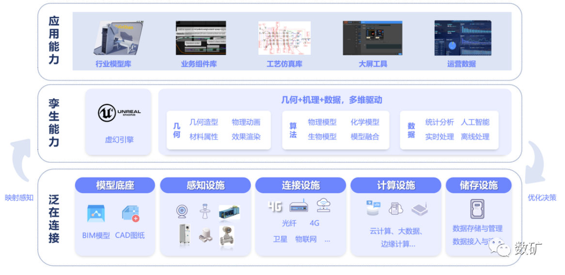孿生能力:基于對物理實(shí)體的數(shù)字化表達(dá),以歷史數(shù)據(jù)、實(shí)時(shí)數(shù)據(jù)為基礎(chǔ),融合幾何、機(jī)理、AI等多種數(shù)學(xué)模型,結(jié)合VR、AR技術(shù)實(shí)現(xiàn)對物理對象的映射呈現(xiàn)、分析優(yōu)化、診斷預(yù)測以及閉環(huán)控制。